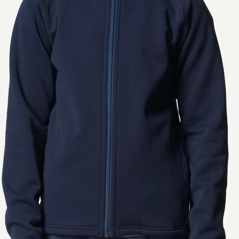 Houdini barnjacka i storlek 80, unisexmodell. Jackan är mörkblå och tillverkad av polyester. Den har huva och dragkedjor framtill och på fickorna.