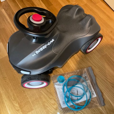 "Big" barnbil i röd färg. Tillverkad i plastmaterial och avsedd för barn att leka med och köra runt på.