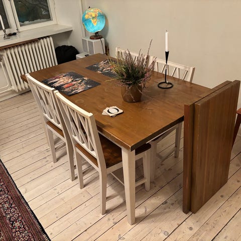 Matbord i målad furu med iläggsskivor och 5 stolar. Bordet är 120 cm långt, med iläggsskivorna 180 cm. Bredd 80 cm, höjd 73 cm. Bordet är stabilt, i bra skick med några små skavanker. Säljes i befintligt skick.