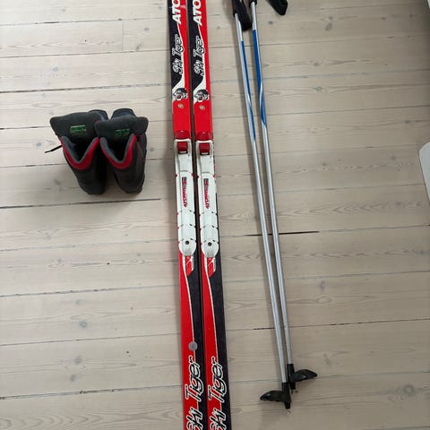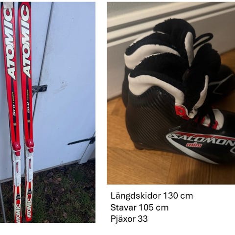 Längdskidor 130 cm, stavar 100 cm, pjäxor 35