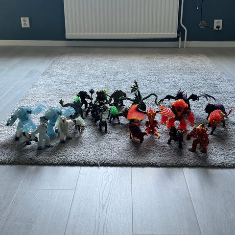 Fem dinosaurier + extra delar så att man kan byta ut kroppsdelar som fötter, svans och fena/plattor.