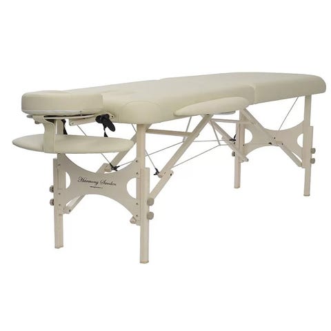 Massagebänk med svart konstläder och justerbara armstöd. Bänken har ett hål för ansikte och är utrustad med avtagbara armstöd för ökad komfort. Stativet är av metall och bänken är designad för enkel transport och användning inom massage och behandlingar.