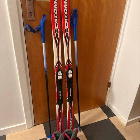 Längdskidor vallningsfria Atomic 130 cm med NNN-bindning från Rottefella. 200kr