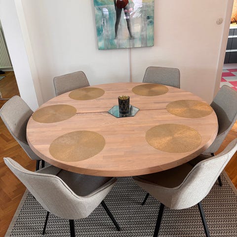 Inköpt 2022. Tecken på användning och ett fåtal märken på skivan finns, men de går säkert bort med lite jobb. Olja för ädelträ följer med (flaskan delvis använd).