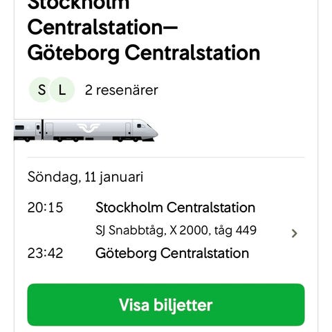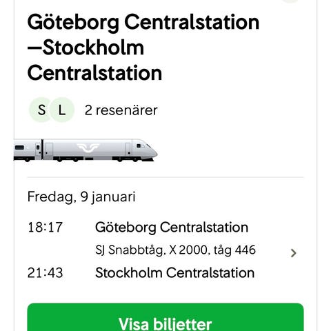 Tågbiljett från Göteborg till Stockholm 01/10 och retur 01/12. Pris kan diskuteras.