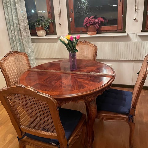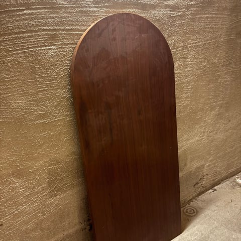 Matbord med bordsskiva i valnöt. Bordet har en rektangulär form och är lämpligt för matplats eller arbetsyta. En kant på bordsskivan har en mindre skada, se bild. Bordet hämtas med benen demonterade för frakt.