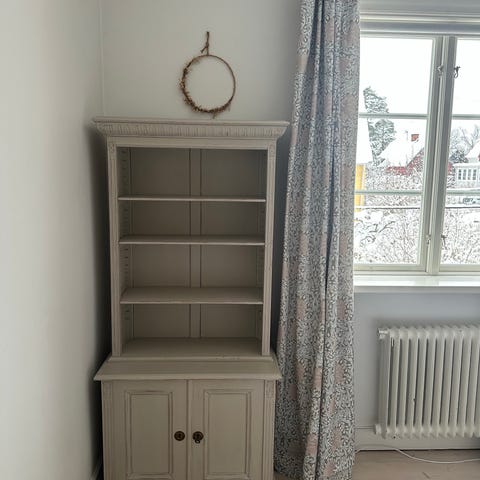 Träskåp med en spegeldörr, flera lådor och förvaringsutrymmen. Skåpet har hyllor och en öppen sektion, lämpligt för förvaring av kläder eller andra hushållsföremål. Flyttbara hyllor i båda skåpen så man tex kan sätta in dammsugaren.