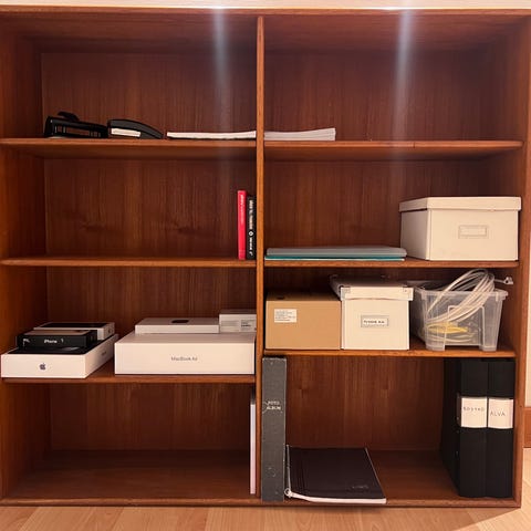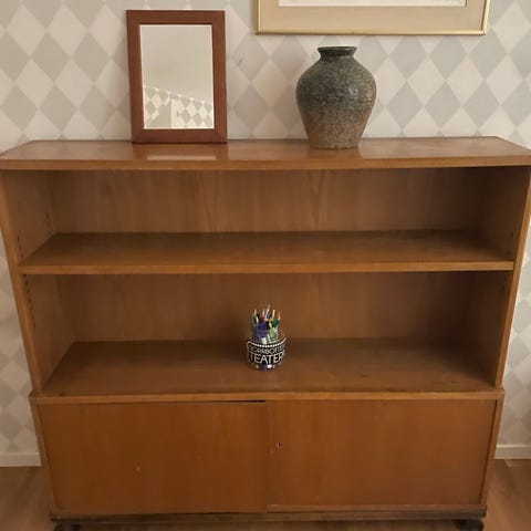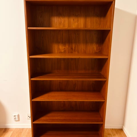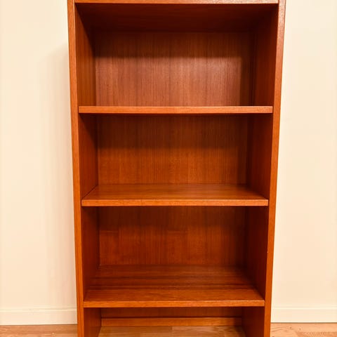 Bokhylla med skrivbordsdel i teakfanér, fint skick från 50-tal. Svensktillverkad. Avtagbara hyllor.