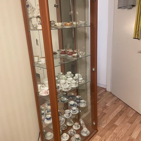 Antikt glasskåp ommålat i vacker gråblå färg. Ljusslinga installerad. Låsbart