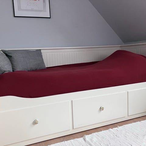 Väl använt - 2 madrasser följa med om man vill ha men de behöver tvättas - en av ribborna gick sönder för länge sen och har varit lagrad och har funkat bra sen dess. Det finns mängder av små marken också som.man kan ser på bilden - därav priset 👍