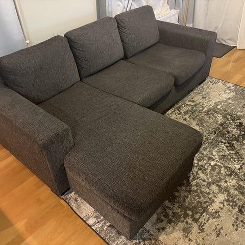 Fin ljusgrå soffa (tresits soffa) från Mio, modellen heter ”Nevada”. Divansoffa med divan på ena sidan och schäslong på andra. Skön att sitta i och i fint skick, ej nedsutten eller liknande. Inköpt 2021. Se sista bilden för mått.