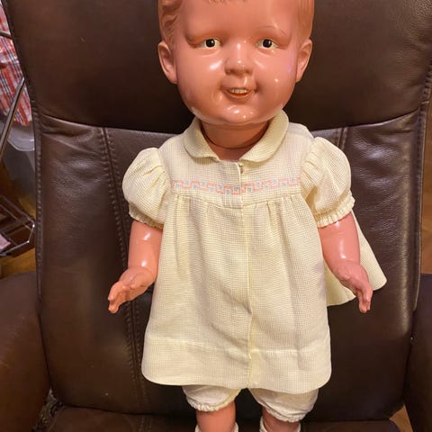 Säljer en äldre vintage docka i plast/celluloid, troligen från 1940–60-talet. Charmig baby-modell med stora ögon, vit overall och mössa. Perfekt för samlare, retroinredning eller nostalgiskt pynt.