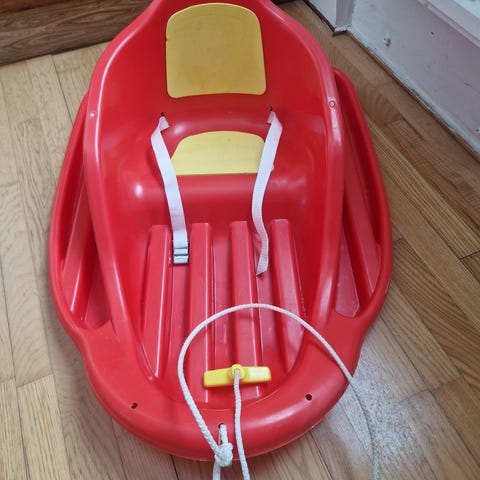 Blå pulka med snöre och bälte. Gett mycket glädje. Finns därav märken i platsen och repor på undersidan, men inget trasigt (se bilder).