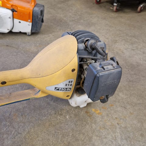 Stiga SGT 226 J grästrimmer med bensinmotor. Modellen har rak rigg och loophandtag framtill för bättre kontroll vid trimning. På bilderna syns trimmerhuvud, skyddskåpa och extra tråd. Passar för trimning av gräs och sly runt kanter, rabatter och andra ytor i trädgården där vanlig gräsklippare har svårt att komma åt.