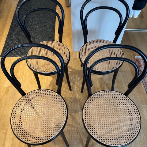 Säljer 4 st TON nr 14 i svart med rottingsits. Två stycken har gått sönder i rottingen så behöver lagas.