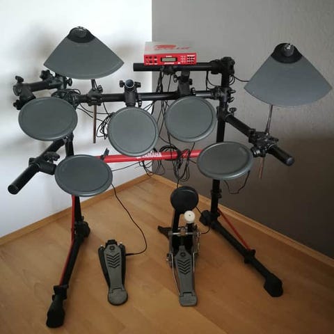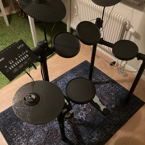 Yamaha DTX elektroniskt trumset med flera trumplattor, cymbaler och en fotpedal. Trumsetet är utrustat med en kontrollenhet för att styra ljud och inställningar. Passar för inomhusbruk och musikövning. Kommer även med trumpinnar i mycket bra skick. Hörlurarna är inte med i paketet