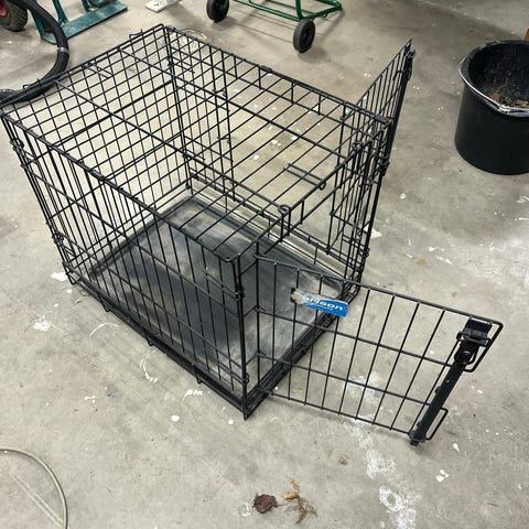 Metallbur avsedd för hundar med en botten av plast. Burens design inkluderar galler av metall för ventilation och sikt. Lämplig för transport eller tillfällig inhägnad av hundar.