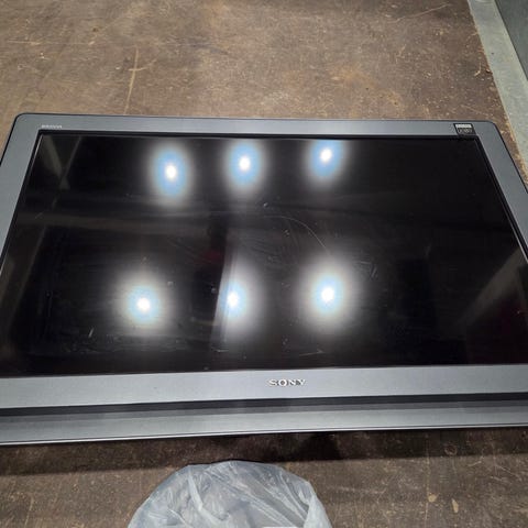 Vit tv, 49 tum. Står på vridbart fotstöd. Inte smart-tv men funkar perfekt med tex apples tv-box.