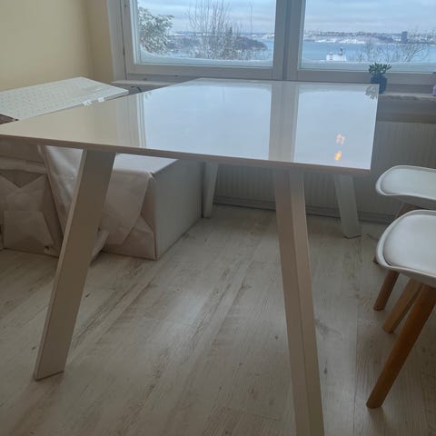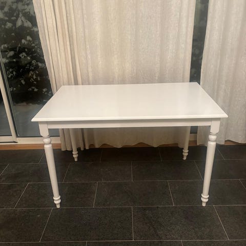 Vit Ikea matbord med svarta stolar, har små repor men inget som påverkar användningen.