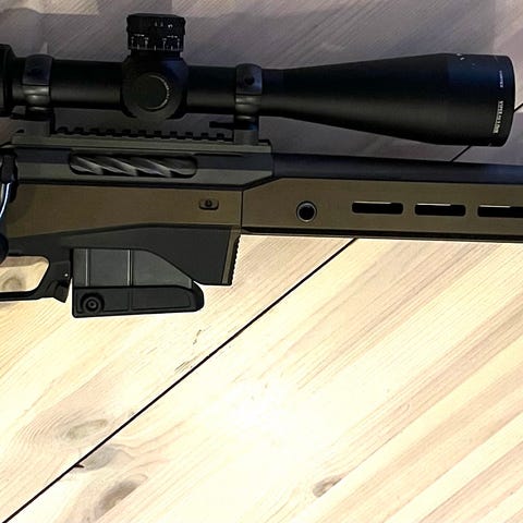 Tikka t1x i prt chassi samt två magasin och ase utra ljuddämpare sitter en 20moa picatinny skena och ett MDT VERTICAL GRIP Elite