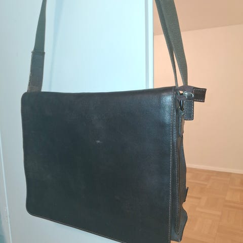 Axelremsväska i läder med två större fack, ett mindre fack med dragkedja och ett ytterfack. Ställbar axelrem och detaljer i mässingsliknande metall. Tillverkad i Sverige men kan tyvärr ej tolka märket, se bild.