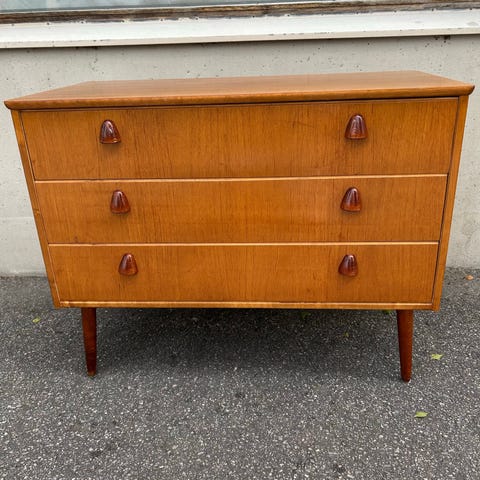 En mycket fin byrå i teak med fyra rymliga lådor. Klassisk retrodesign med snygga infällda handtag å stabila ben.