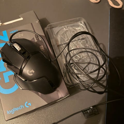 Logitech G703 trådlös gamingmus med tillhörande USB-mottagare.