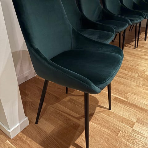 Stol stolar chair chairs sammet grön mörkgrön mörk dark green velvet märkesstol matstol matbordsstol matrum kök köksstol kitchen premium stål bra skick sammetsstolar kvalitet quality Skåne helsingborg tyg fabric