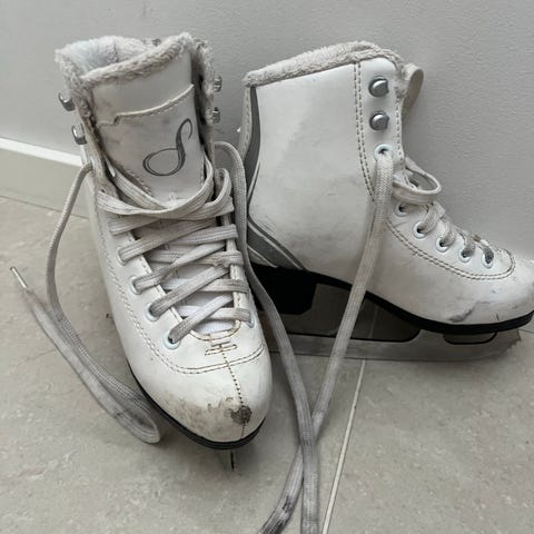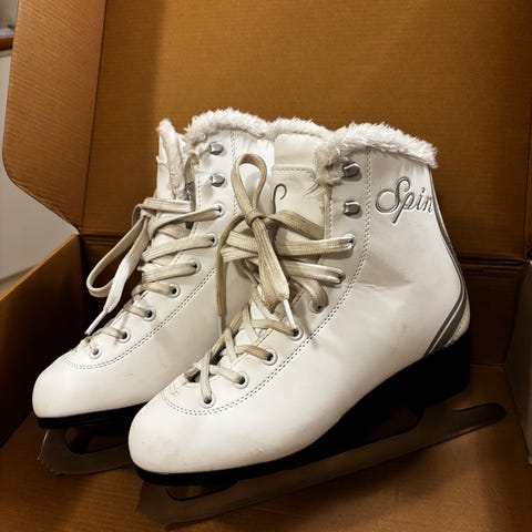 Spin skridskor för barn i storlek 36. Skridskorna är vita med svart sula och metallblad. Passar för olika typer av skridskoåkning.