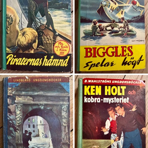Fem bokserie barnböcker med olika titlar som 'Fem och Kidnapparna', 'Fem på äventyr', 'Fem på smugglarjakt' och 'Fem på kanotvandring'. Böckerna är på svenska och riktar sig till barn.