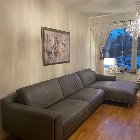 Liten färgskiftning/”fläck” (inget som spilts) på divan delen, syns endast diskret i visst ljus, se bild. Säljes pga flytt där divandelen tyvärr är på fel sida för nya hemmet. Prydnadskuddar+filt första tre bilderna ingår ej.