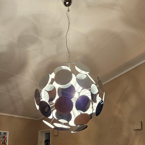 Grå lackerad metall och upphängning med motvikt. Passar fint över matbordet eller i vardagsrum och ger ett tidlöst, nordiskt uttryck.