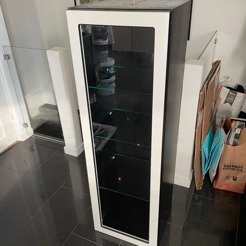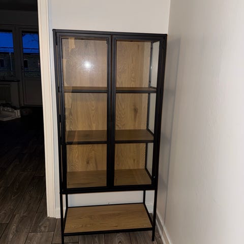 Mörkgrått låsbart vitrinskåp i plåt från IKEA. 1 plåthylla och 2 glashyllor. Nypris 2995:-