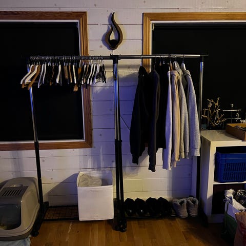Enklare garderob med 2 skjutdörrar, 2 flyttbara hyllor, 2 st klädstsång och 25 vita trägalgar. Knappt använd då den stått i gästrum.