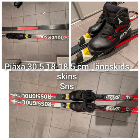 Första längskidsettet, 2 par stavar och 110cm skidor. Används med vanliga skor/Kängor
