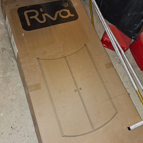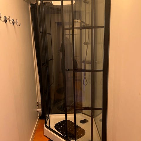 Dörrarna har ett frostat område i mitten på dörren och klarglas uppe och nere. I bra skick, avtvättade, men behöver en avkalkning när de är uppsatta. Inget är trasigt och allt som behövs för montering medföljer.