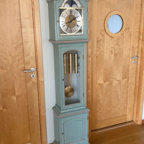 Golvur i antik stil med vit färg. Klockan har en rund urtavla med siffror och dekorativa detaljer på toppen och runt urtavlan. Klockan är av trä och har en pendel synlig genom en rund öppning i mitten av kroppen.