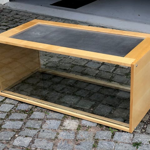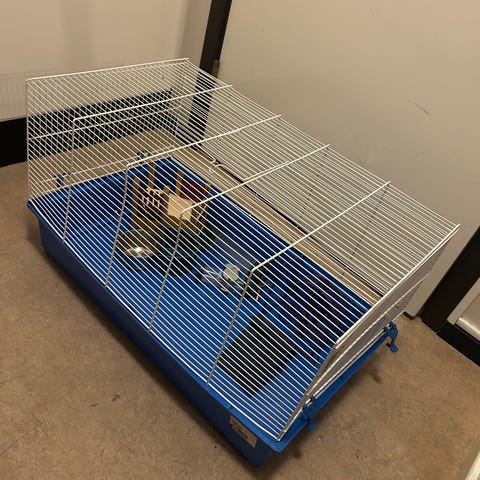 Bur för smådjur med vit plastbotten och blått metallgaller. Burens design inkluderar en öppningsbar dörr och den står på fyra ben för att höja buren från golvet. Passar för små husdjur som hamstrar, möss eller andra små gnagare. 80×75 cm