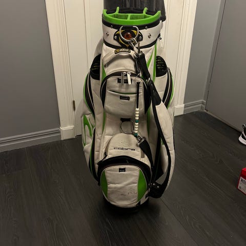 Cobra Golfbag Standväska i flerfärgad design. Utrustad med bärrem och stödben för enkel transport och stabilitet på golfbanan. Flera förvaringsfack för golfklubbor och tillbehör. Bagen är i använt skick men fungerar bra utan några problem. Alla fickor fungerar samt att det finns en kylficka för vattenflaskan. Det är lite slitage då färg trillat av, det ena benet är även en aningen böjt inget som påverkar bagens funktion. I övrigt är det en stilren bag som fungerar prima.