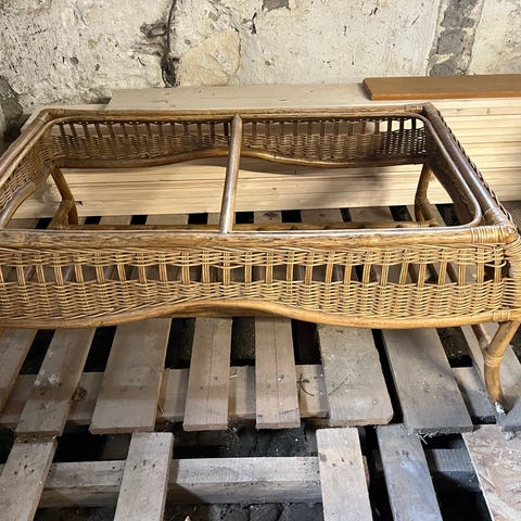 Säljer ett charmigt soffbord i rotting med tydlig 80-talskänsla. Ett dekorativt och stabilt bord som passar perfekt i vardagsrum, uterum eller som en retro detalj i hemmet.