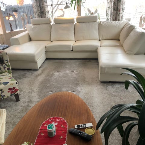 Antricit-färgat tyg, ekfärgade ben. Inköpt från Severins möbler för ca 5 år sen, cirkapris 24 000 kr. Mått: 300x240x100 cm, sitthöjd 45 cm. Högt ryggstöd. Skick: Bra skick, några små skönhetsfel finns men inget som stör. Säljes för 3000 kr eller högstbjudande.