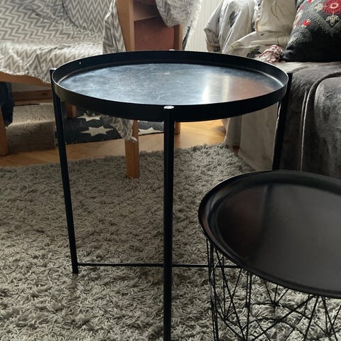 Svart runt sidobord tillverkat i metall. Bordet har en rund bordsskiva och ett enkelt, stabilt underrede. Passar för användning som sidobord eller avlastningsbord både inomhus och utomhus. Hämtas av köpare.