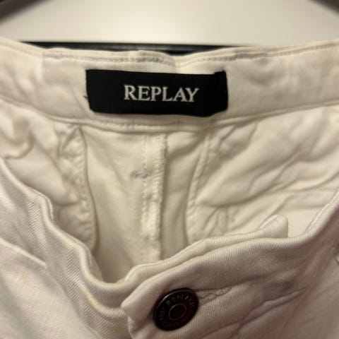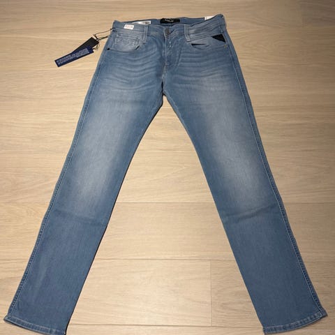 Replay Zeumar herrbyxor i storlek L med midjemått W33. Byxorna är grå och tillverkade i bomull. Designade för herrar.hyper stretch obs byxan köpt 2024 och är fabriks sliten