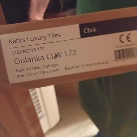 Vinylgolv 3 mm tjockt från Gerflor. Grå, klinkerimitation av kalksten. "Plattorna" är 31x31 cm. Mattan har måtten 2720x4180 cm