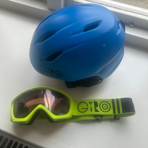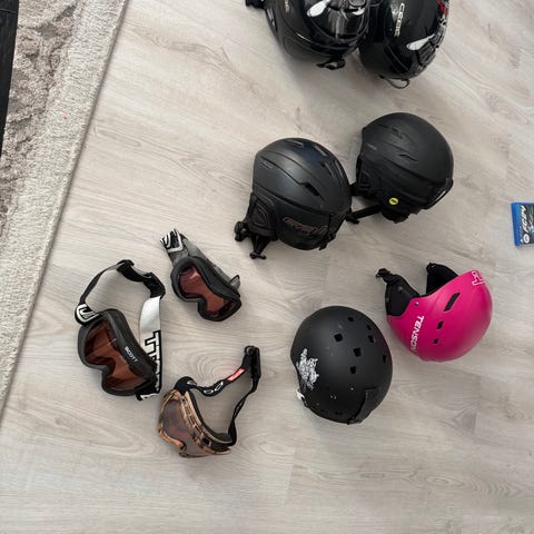 Två barnhjälmar (båda har fäste för go-pro kamera men det kan tas bort), ett par skidglasögon (en repa finns) samt sele för att åka med mindre barn