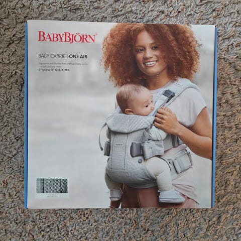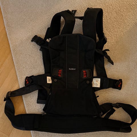 BabyBjörn One bärsele i svart färg. Bärselen är designad för att bära barn i olika positioner och har justerbara remmar för att passa olika kroppsstorlekar. Materialet är mjukt och anpassat för att ge stöd och komfort både för barnet och bäraren.