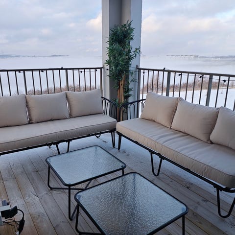 Utemöbelset bestående av två lounge soffor med bekväma dynor. Setet är designat för utomhusbruk och passar för att skapa en sittgrupp på trädäcket, terrassen eller balkongen.