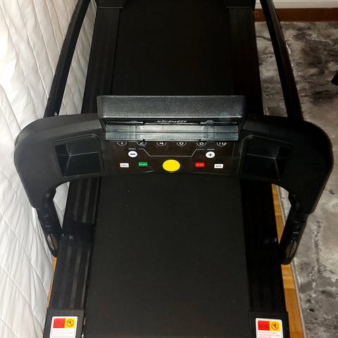 Elektriskt gång/ löpband med handtag och löpyta med röd matta. Passar för hemmaträning och konditionsövningar.