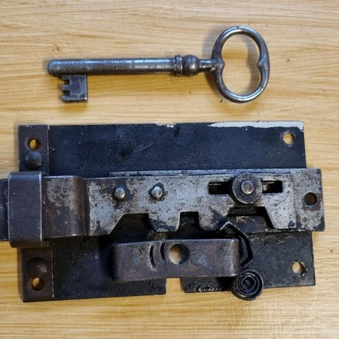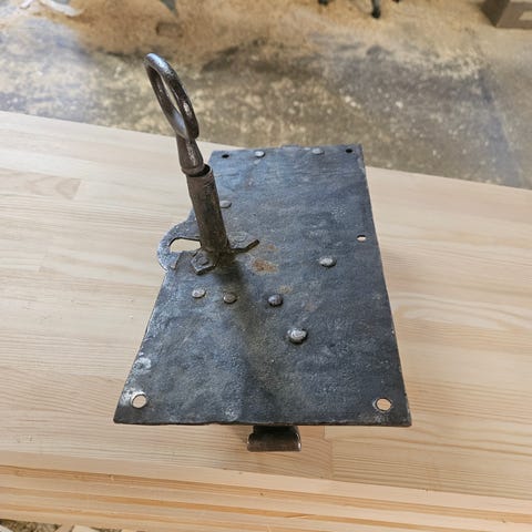 Smideslås/vedlås med nyckel - Hakgångjärn - Gångjärnstappar mm. Byggnadsvård.