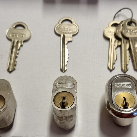 4 smideslås/vedlås. Till ett av låsen finns det nyckel, de andra tre saknas.